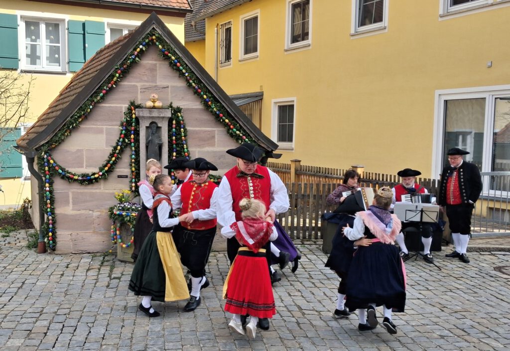 Frohe Ostern! Der Osterbrunnen ist geschmückt, der Schiltbrunnen am Gabrieliplatz. Tanz der Trachtenjugend
